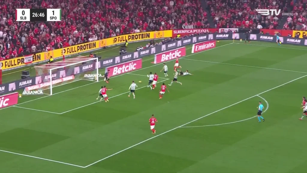 A forma como Mourinho logo tentou puxar pela raça da equipa batia no “outro lado do jogo”, o dos posicionamentos leoninos de marcações individuais, com o seu duplo-pivot (Hjulmand-Morita) a apanhar os dois médios benfiquistas (Enzo-Rios) ficando Fresneda para ir mais dentro e apanhar Sudakov. Ficava Barreiro à procura do espaço entrelinhas.